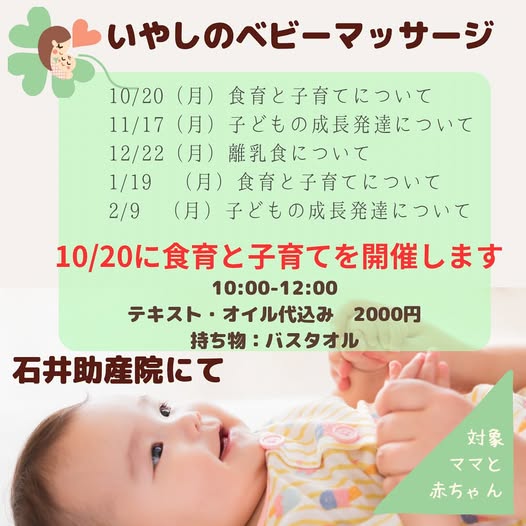 【10/20(月)にベビーマッサージ&食育と子育ての講座】を開催します。