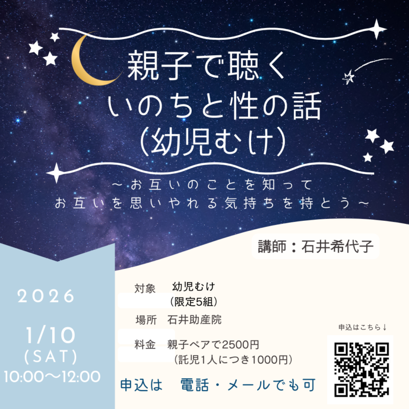 2025.12.25 性教育 幼児向け Ki-chan 開催日: 2026年1月10日カテゴリー: 講座 お申込みはこちら もしくは TEL 0742-26-3581 石井助産院 石井先生プロフィール 石井希代子院長 助産師FacebookInstagramLINEプロフィールページはこちらから御覧ください。